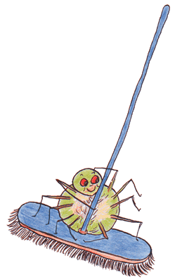 | Die Spinne Schlackerbein Ein Besen fegte durch den Flur. Er fegt in alle Ecken. Der Spinne Schlackerbein entfuhr ein Schrei vor lauter Schrecken. Nur weiße Wände ringsumher. Wohin sollt sie sich drücken? Da brummt der Besen: " Bitte sehr, setz dich auf meinen Rücken." Schlackerbein liebt Abenteuer, lässt sich nicht lange bitten. Obwohl es ihr nicht ganz geheuer, sie ist noch nie geritten. Hui, bald schon fegt sie auf und nieder, schlingt um den Besenstiel ein Bein und flüstert: " Kommst du morgen wieder? Dann mache ich den Führerschein." |